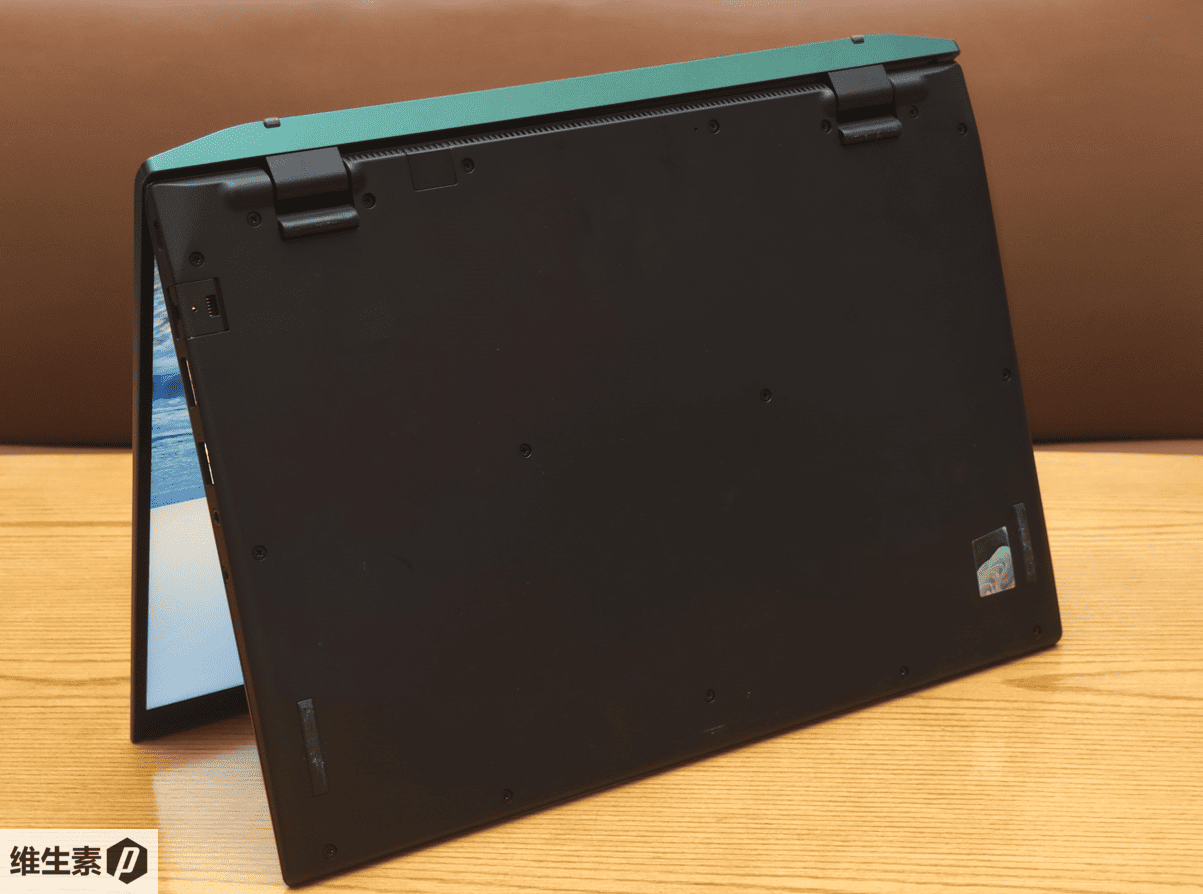 开盖后,尾部会沿着这个斜面向下,逐渐到达支撑位,在有两个小保护垫的支点下,把整个键盘面撑起太高,同时隐藏掉屏幕底部的面积。