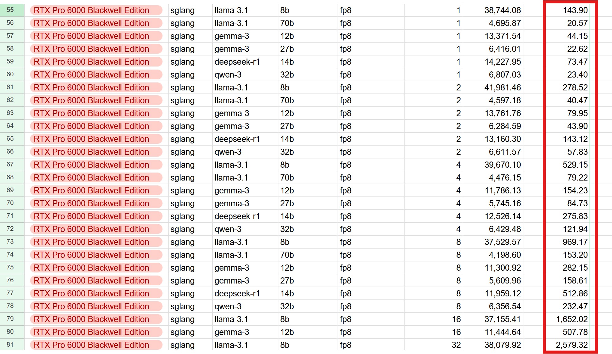 看企业并发场景下,32并发总输出2579,单个用户能到80 token/s。
